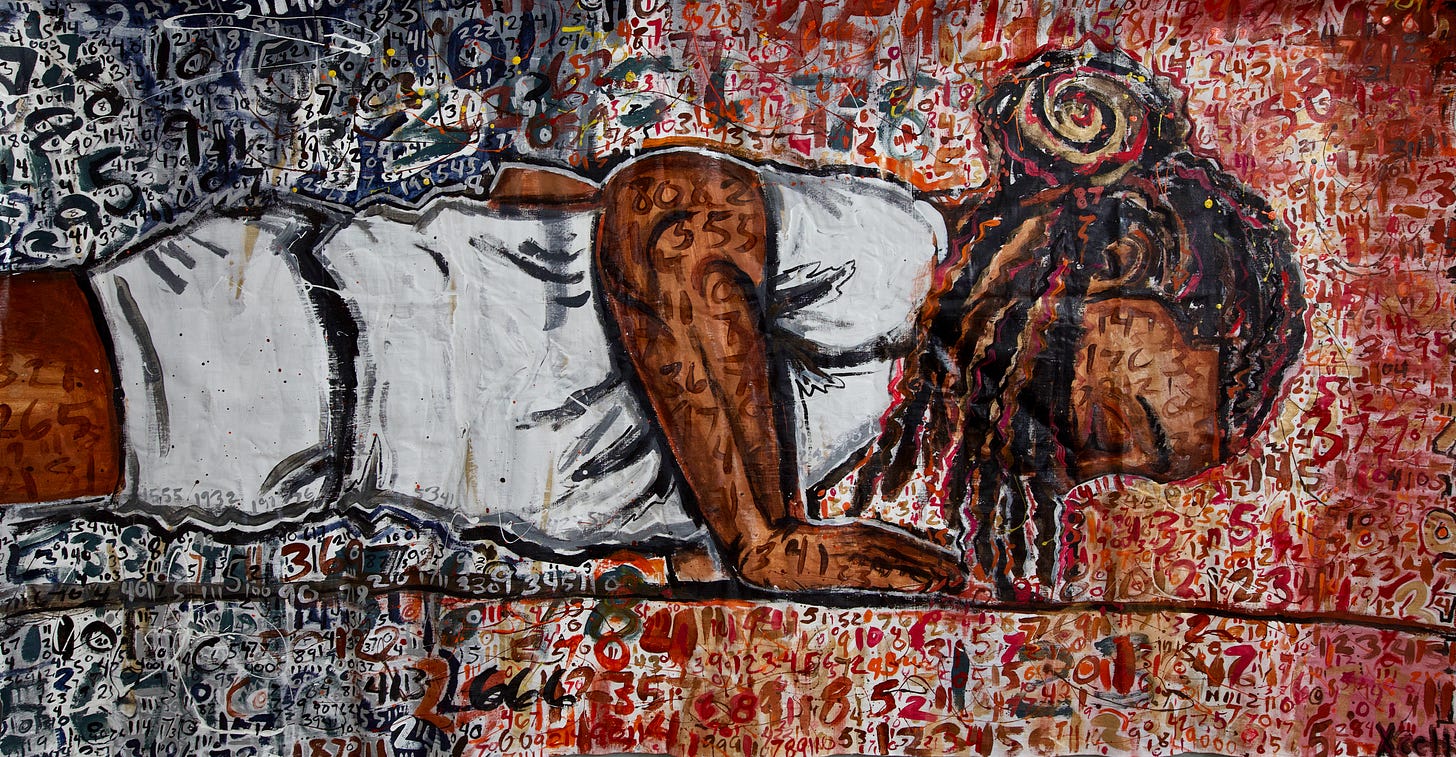 “I painted this to remember what survival really feels like. I was in solitary confinement with nothing but a t-shirt, boxers, and cold concrete. My body was shaking from the cold, and the only way I could fight it was to move. I dropped down for push-ups, then got up pacing the room. Over and over. Just to stay warm. The numbers scattered across the piece mark every rep, every refusal to break. This is a piece about endurance, discipline, and perseverance.”